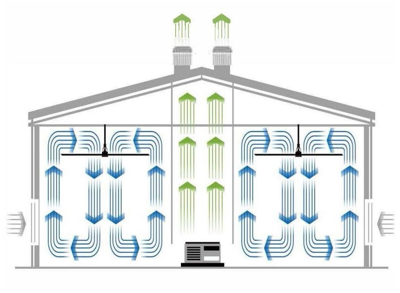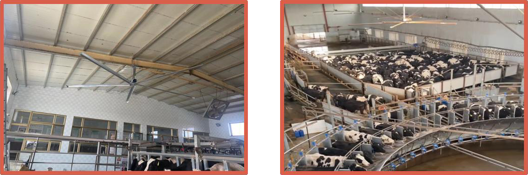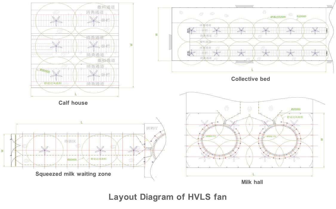Энергосберегающий вентилятор HVLS предназначен специально для больших пространств пастбища. Он использует технологию HVLS (High Volume - Low Speed, высокий объем воздуха, низкая скорость),и совместно с профессиональными крупными лопастями вентилятора и мотором обеспечивает большой объем почти естественного циркулирующего воздуха, эффективно решая проблемы жаркого и влажного пространства и слоистости воздуха. Обеспечивая коровам полный спектр комфортного естественного ветра, снижает стресс коров. В настоящее время широко используется на европейских пастбищах.