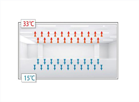 Лопасть HVLS-вентилятора циркулирует поток воздуха вверх и вниз, полностью перемешивая поток воздуха и эффективно устраняя температурную стратификацию.